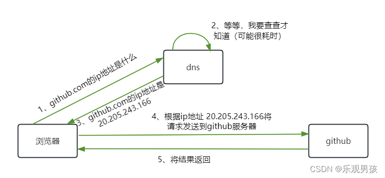 當我們在瀏覽器中輸入github的網址:https://github.com/,瀏覽器并不能根據該地址直接訪問github服務器。在請求發給github服務器之前,需要先根據輸入地址中的域名github.com,從遠程dns查找該域名對應的ip地址,然后根據ip地址才能將請求發送到github服務器。流程如下: