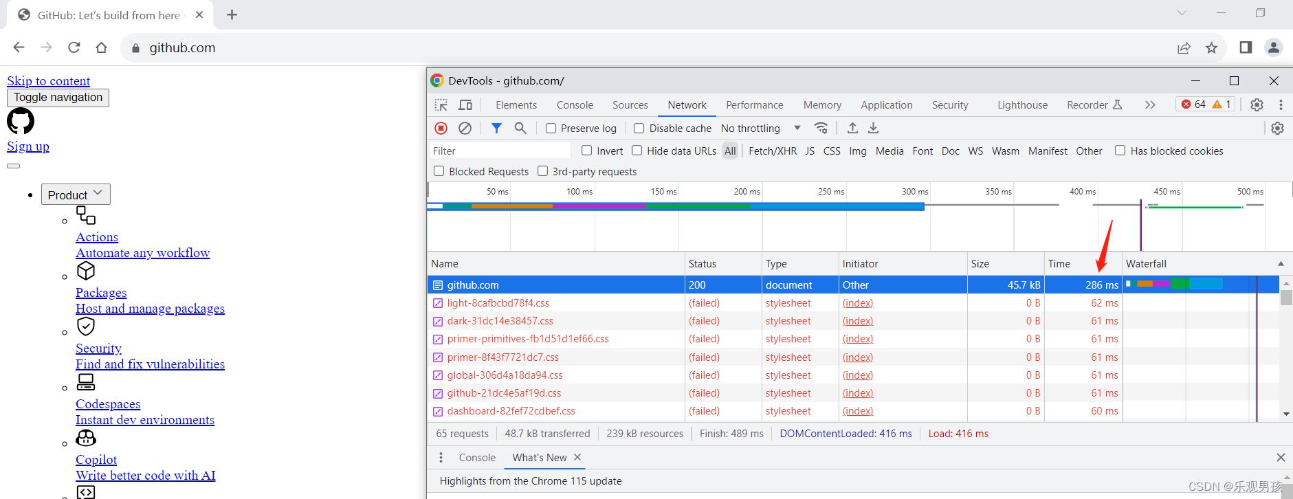 但是很奇怪,現在雖然訪問到了github,但是頁面布局錯亂,完全沒法看。從上圖的瀏覽器網絡請求上看,發現很多css樣式文件都加載失敗,所以網頁布局錯亂,應該就是css資源加載失敗導致的。查看下請求css資源的地址,發現它的域名與github的域名不一樣,猜測也是根據域名轉ip影響的: